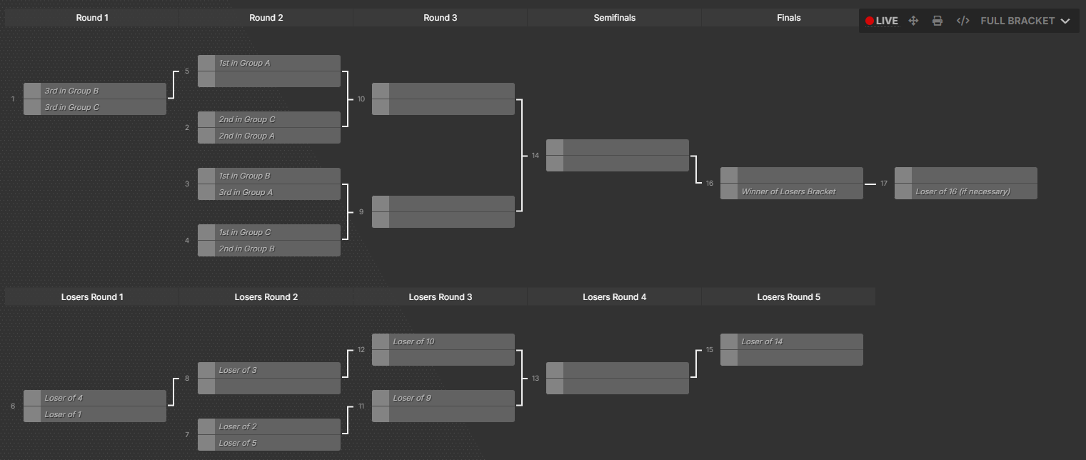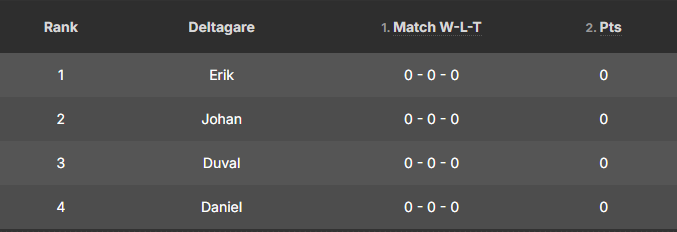 You starts with a group stage were you play of head-to-head matches with all players on your card. You play all positions on your station and report your score and who wins and looses. Based on your total score we find out who advances to the next stage.